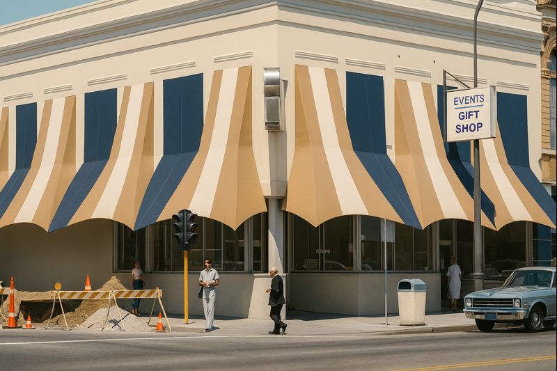 First designer style domed awning concept in Sacramento by Janak & Scurfield Inc. 1967 for Grebitus Jewelers 11 & K St.